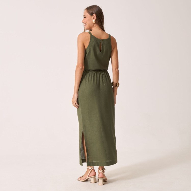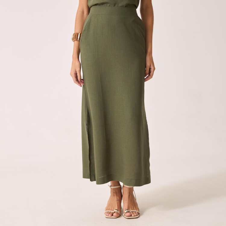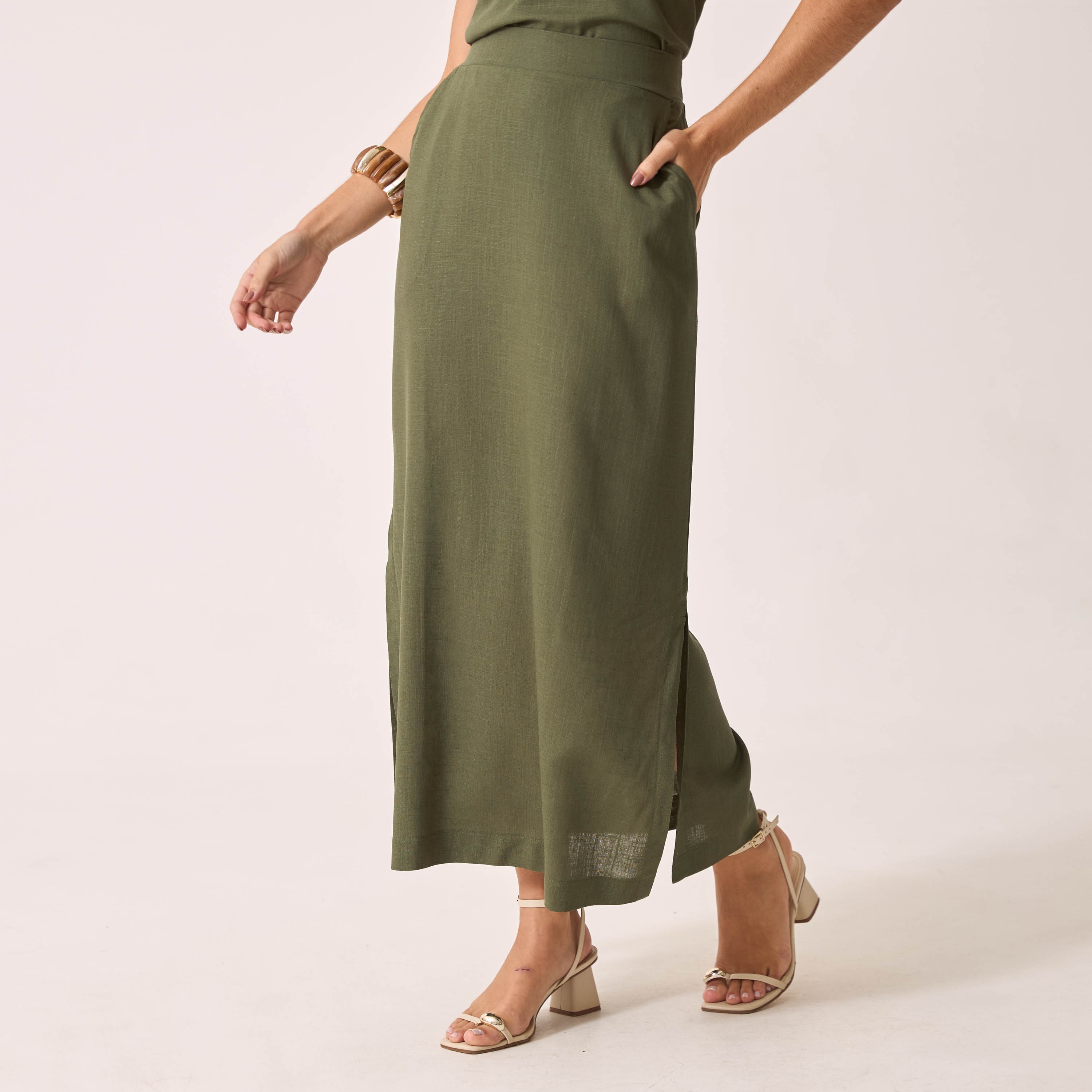 A saia de linho com elástico nas costas une conforto e elegância. Leve e respirável, tem caimento sofisticado e ajuste confortável que valoriza a silhueta. Versátil, combina com looks casuais ou mais arrumados, sendo uma peça essencial em cores neutras e atemporais.