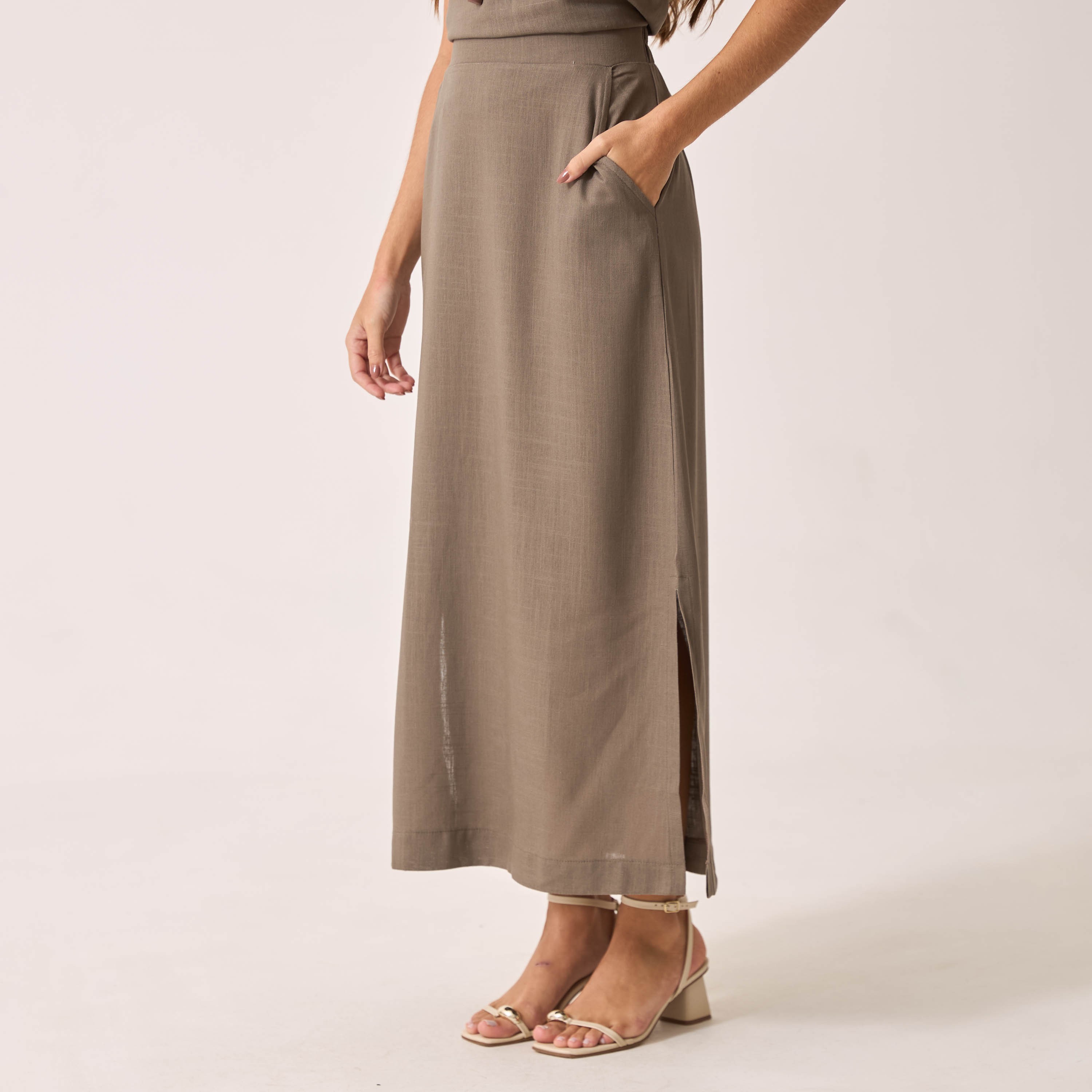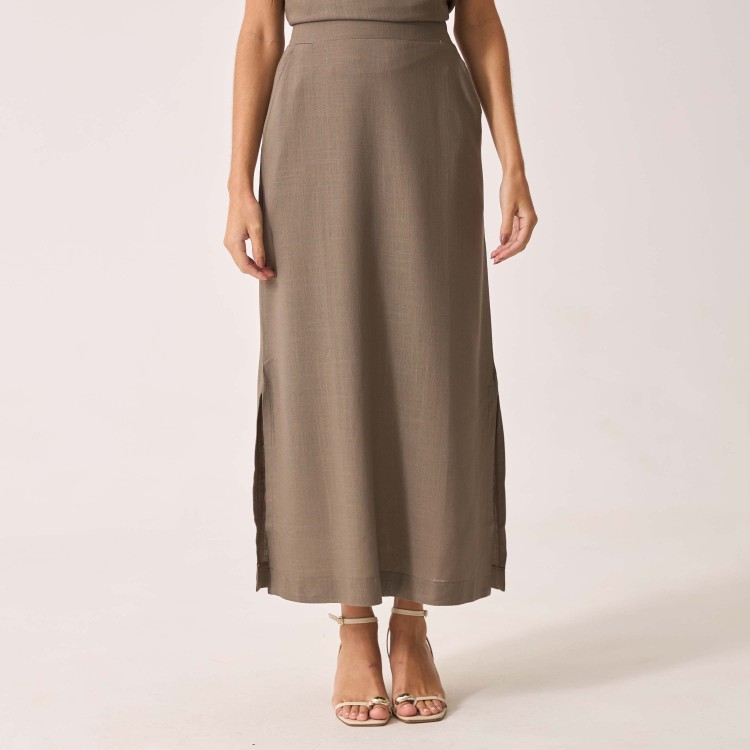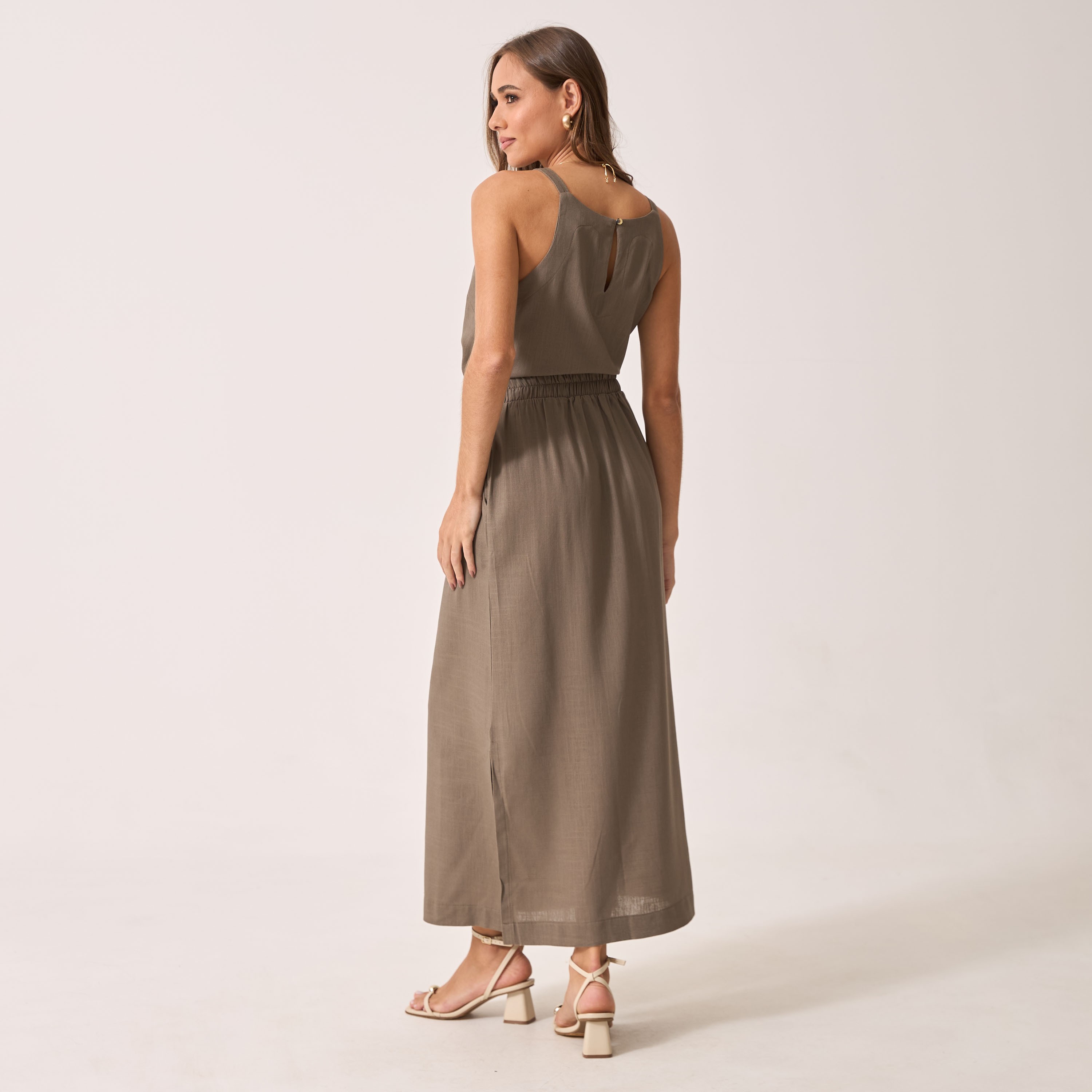 A saia de linho com elástico nas costas une conforto e elegância. Leve e respirável, tem caimento sofisticado e ajuste confortável que valoriza a silhueta. Versátil, combina com looks casuais ou mais arrumados, sendo uma peça essencial em cores neutras e atemporais.