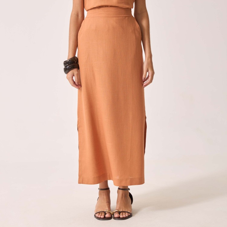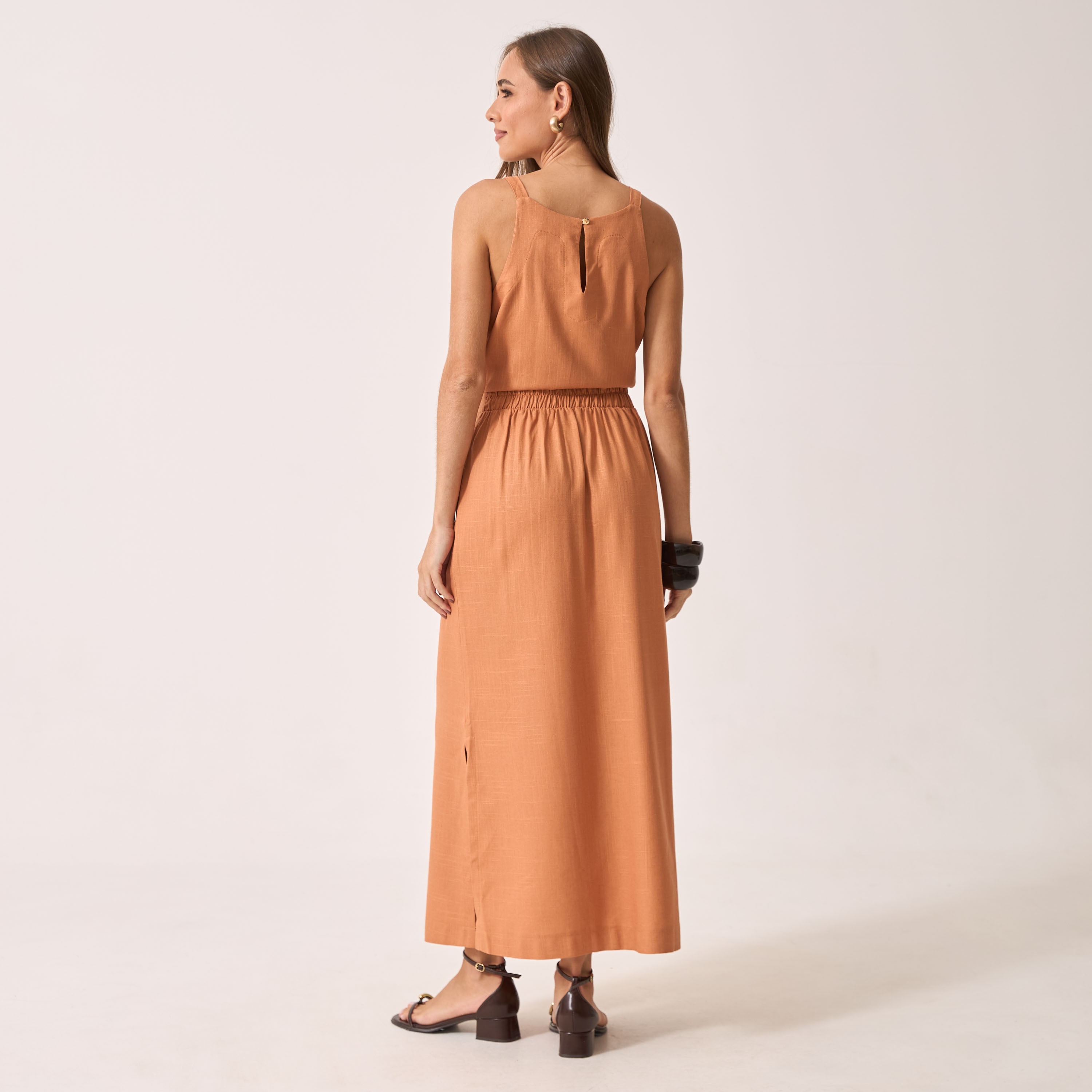 A saia de linho com elástico nas costas une conforto e elegância. Leve e respirável, tem caimento sofisticado e ajuste confortável que valoriza a silhueta. Versátil, combina com looks casuais ou mais arrumados, sendo uma peça essencial em cores neutras e atemporais.