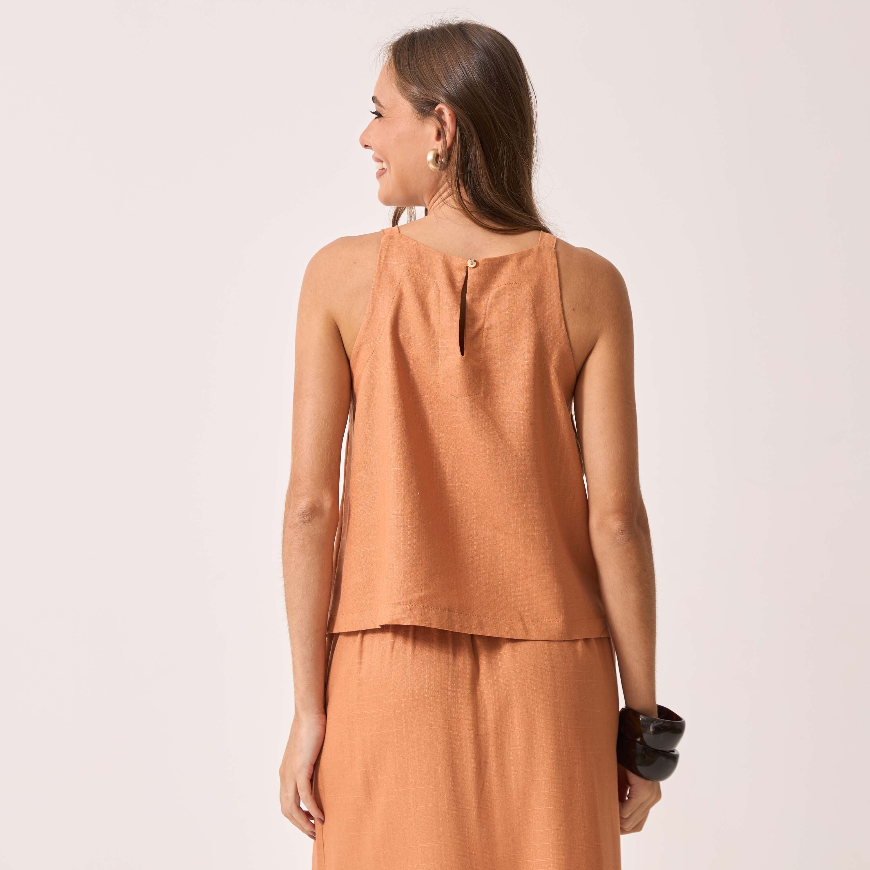 Blusa sem mangas confeccionada em tecido leve e de ótimo caimento, traz um visual moderno e elegante. Versátil e confortável, pode ser usada sozinha ou combinada com a saia do mesmo tecido para um conjunto harmonioso.